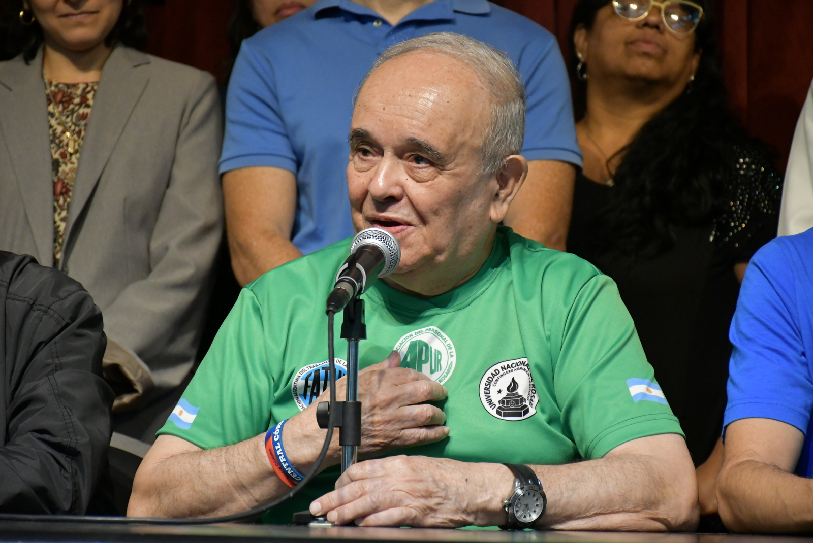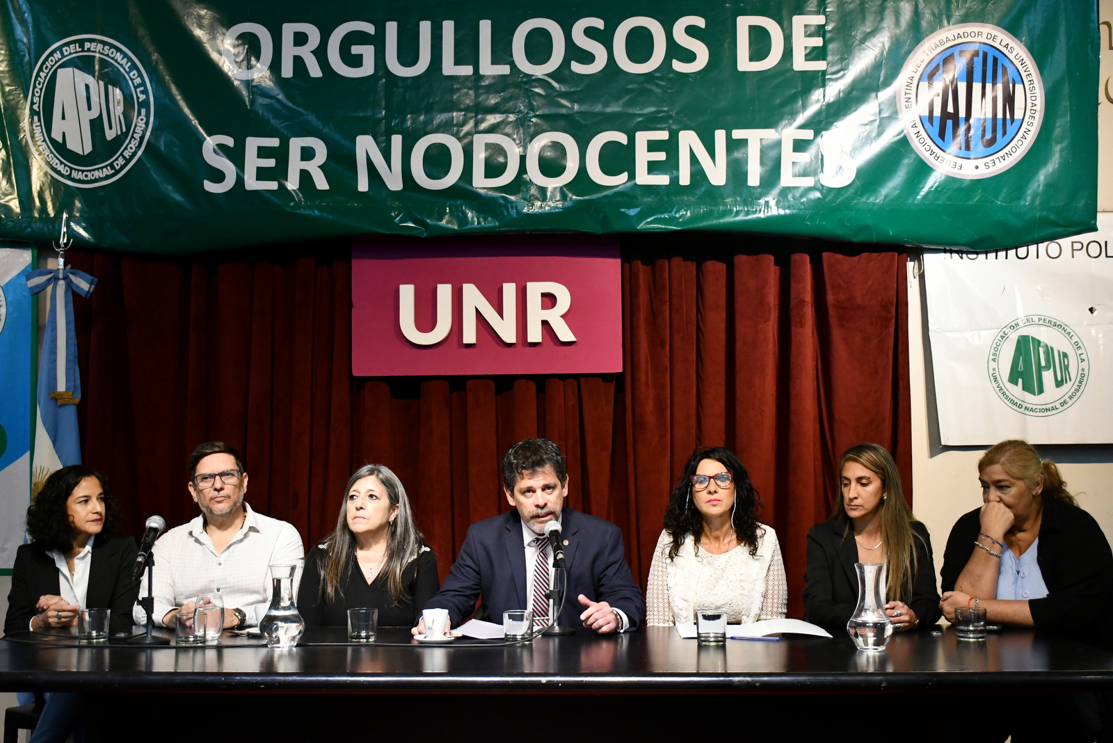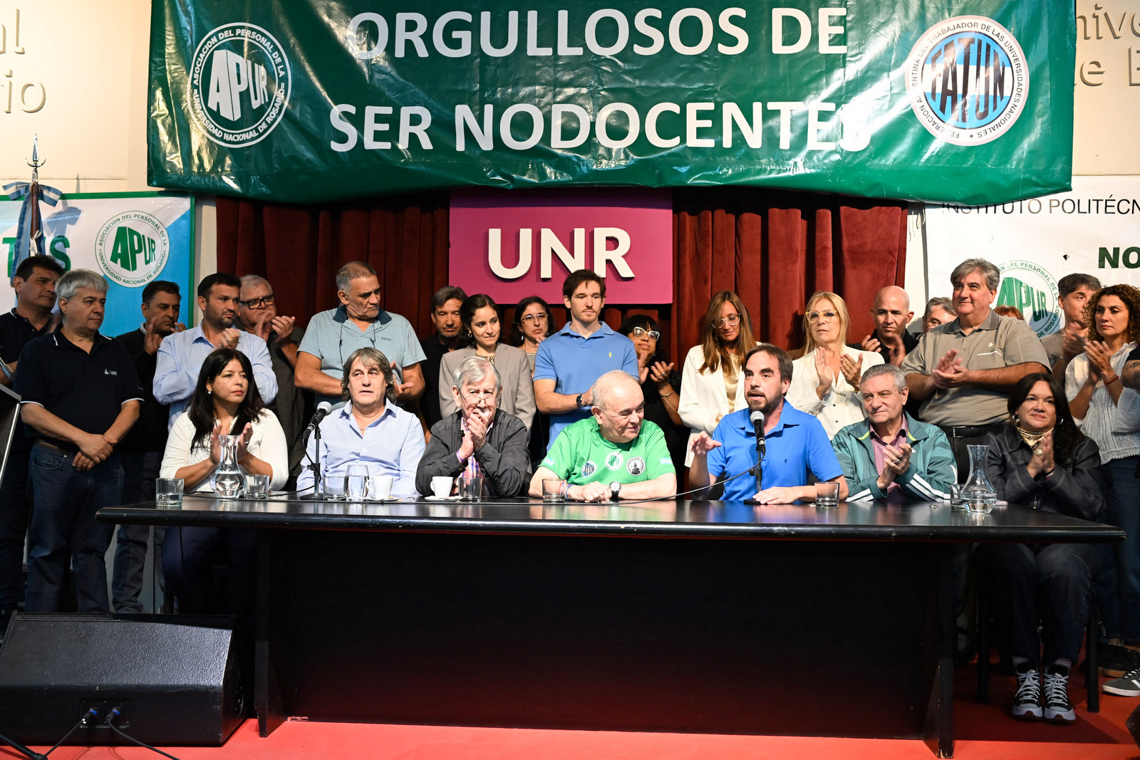Luego las nuevas autoridades de APUR subieron al escenario. Allí el flamante Secretario General Miguel Roldán agradeció a todos los presentes y destacó la importancia de la participación Nodocente en la vida institucional de la Universidad, así como el rol fundamental de la organización gremial en la defensa de los derechos laborales, la mejora de las condiciones de trabajo y la lucha permanente por salarios dignos.