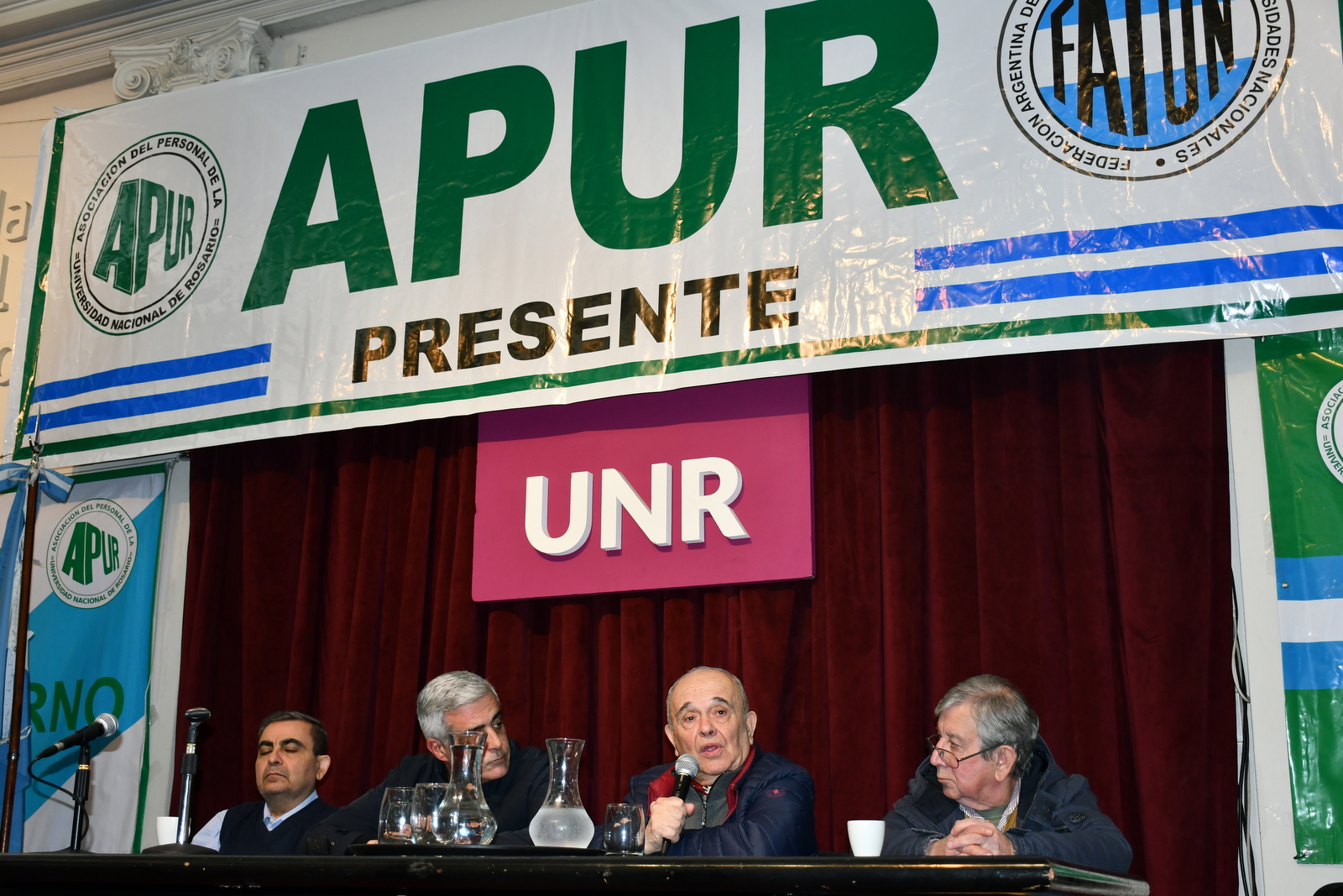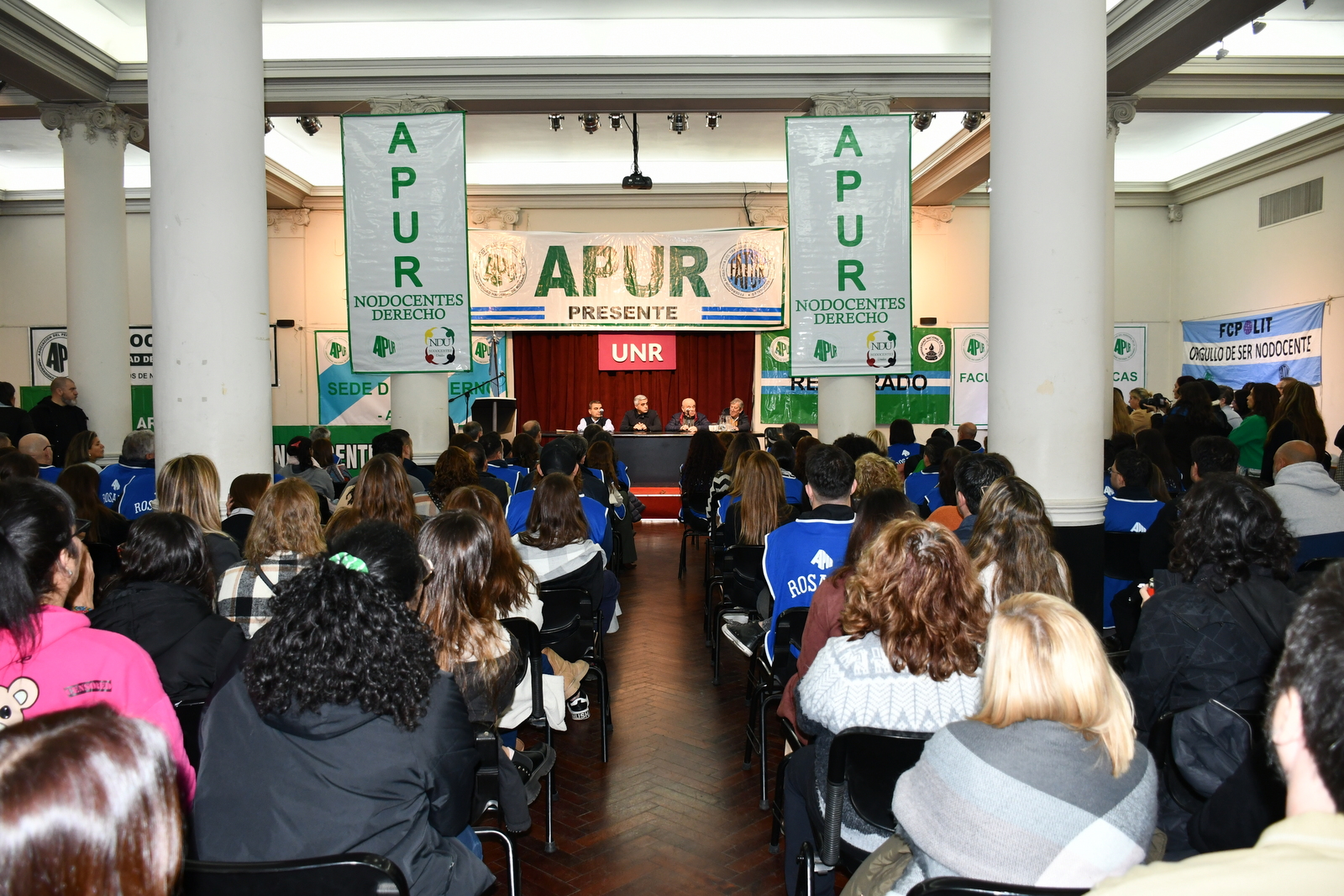 Con un salón colmado —acompañado por bombos y saxo en vivo—, participaron trabajadoras y trabajadores Nodocentes, junto a autoridades de la Universidad Nacional de Rosario. En el escenario estuvieron el Rector de la UNR y vicepresidente del CIN, Franco Bartolacci; el Vicerrector Darío Masía; el Secretario General de APUR, Miguel Roldán; y el Secretario Adjunto, Jorge Rojas.