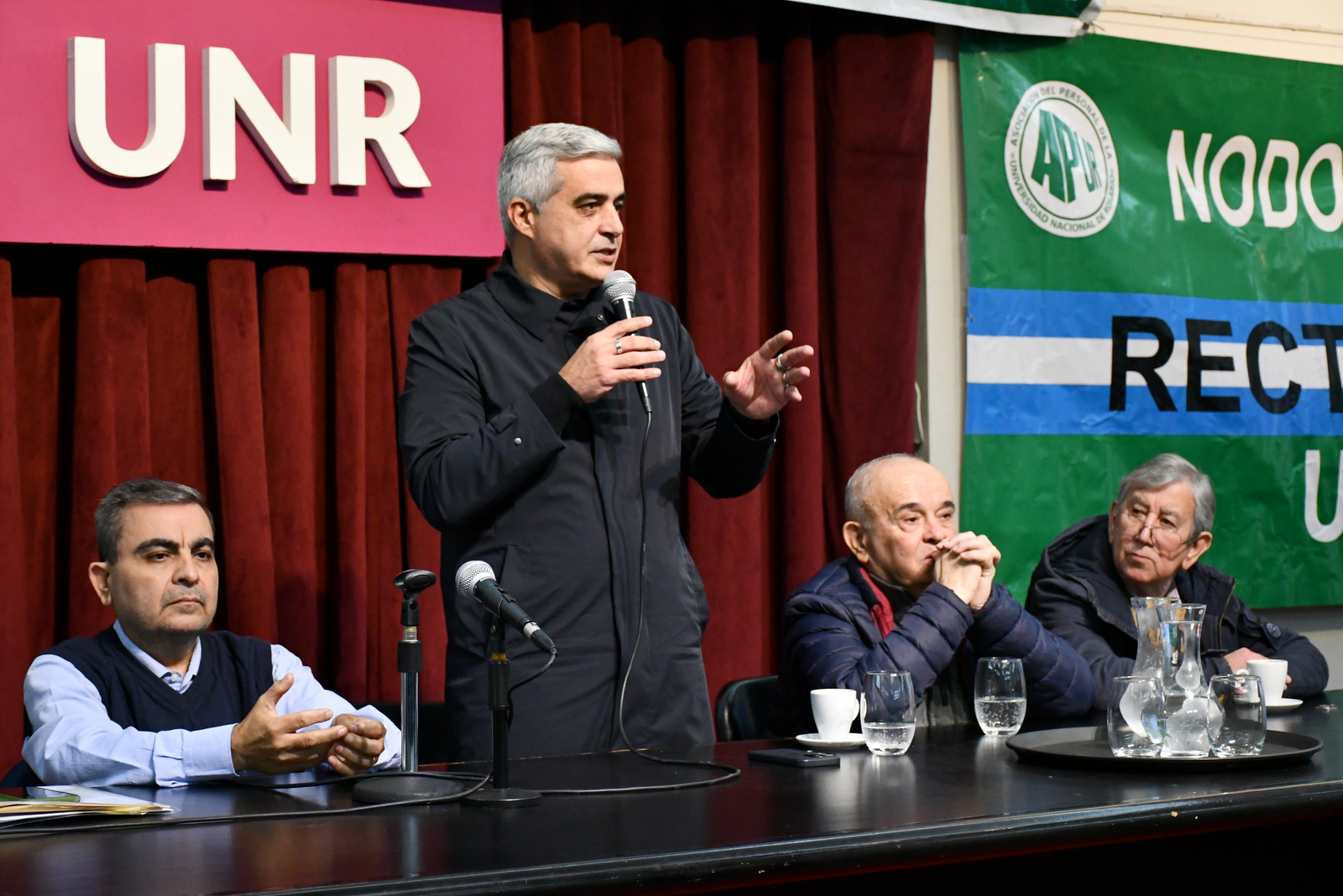 El Rector Franco Bartolacci puso en perspectiva la situación actual de la Universidad y el valor estratégico de la propuesta legislativa: “La UNR creció de 20.000 reinscriptos en 2023 a más de 31.000 este año, y batimos récord de graduados con 3.495 egresados en 2024. Todo ello, a pesar de las condiciones tan adversas. Si la Universidad puede aportar algo valioso en este contexto sombrío, es gracias al compromiso de cada uno de ustedes. Esta no es una defensa corporativa, es una causa nacional: la universidad argentina necesita que la respeten, la cuiden y la financien. Este proyecto de ley propone un 1 % del PBI para 2026, y 1,5 % para 2031. Hoy estamos en 0,6 %, el punto más bajo de nuestra historia. Sin recursos, no habrá forma de sostener ni la educación ni la ciencia que producimos.”