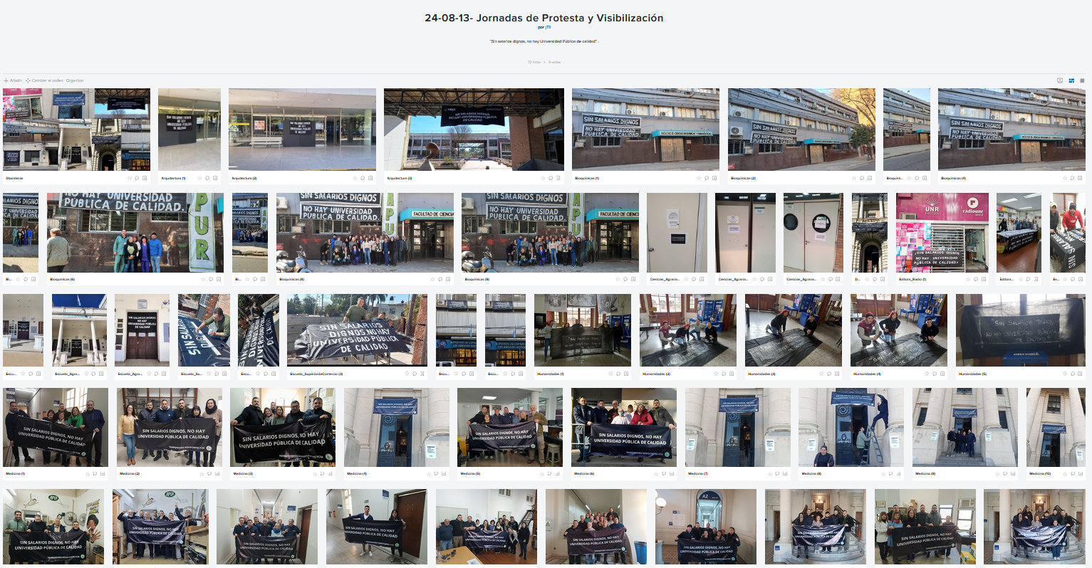 En el marco del plan de lucha por la recuperación del poder adquisitivo de nuestros salarios que estamos llevando adelante las trabajadoras y los trabajadores que integramos el Frente Sindical de Universidades Nacionales, la Comisión Directiva de APUR y Junta de Delegados nuevamente destaca y reconoce el compromiso del personal Nodocente de la Universidad Nacional de Rosario que ha acatado en un 99% el Paro sin concurrencia a los lugares de trabajo realizado el día lunes 12 de agosto y que ha participado activamente de las jornadas de 48 horas de protesta y visibilización realizadas los días 13 y 14 de agosto con las confecciones de Banderas con letras blancas sobre fondo negro con la frase “Sin salarios dignos, no hay Universidad Pública de calidad” colocadas en todas las dependencias de la UNR.