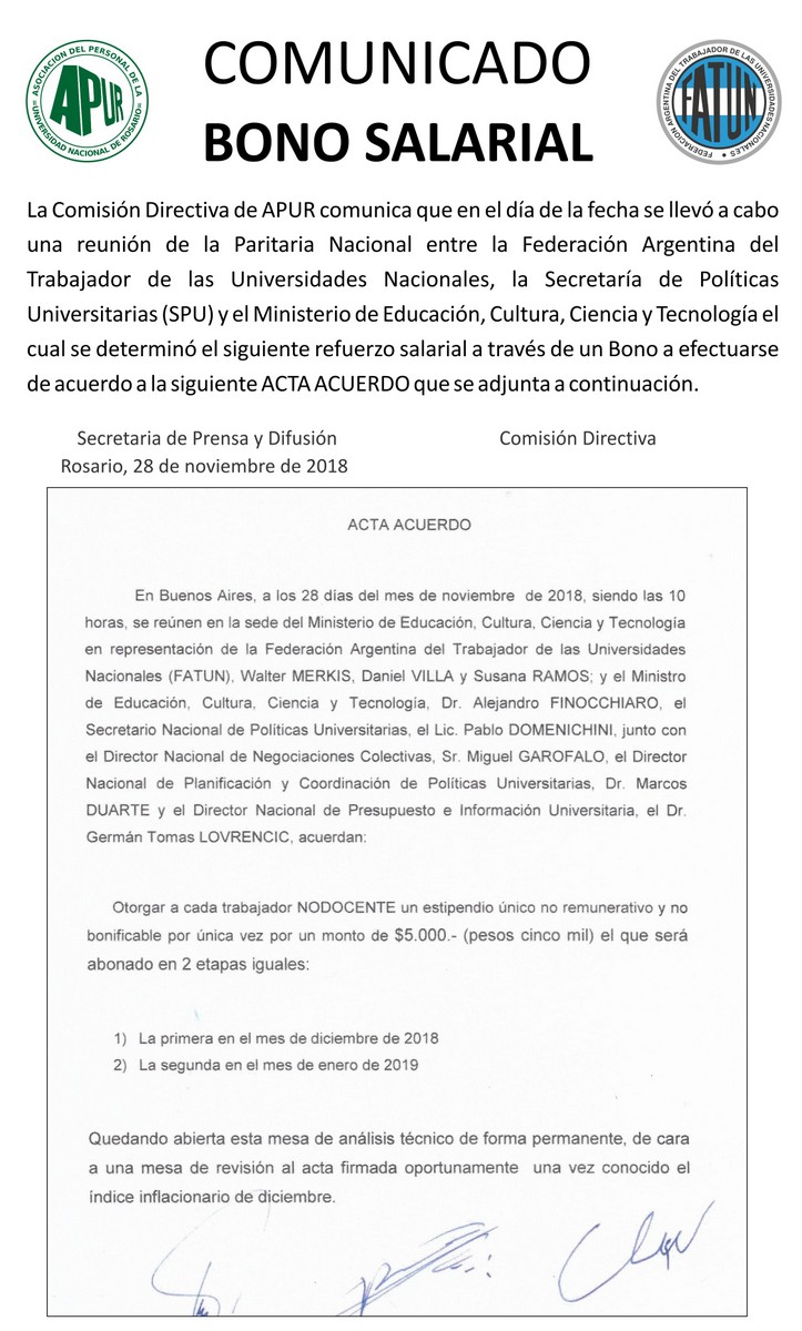 La Comisión Directiva de A.P.U.R. comunica a todo el personal No Docente de la U.N.R. que se acordó en Paritaria Nacional un incremento salarial del 27,4% para el año 2015, en 2 etapas (Junio y Agosto).